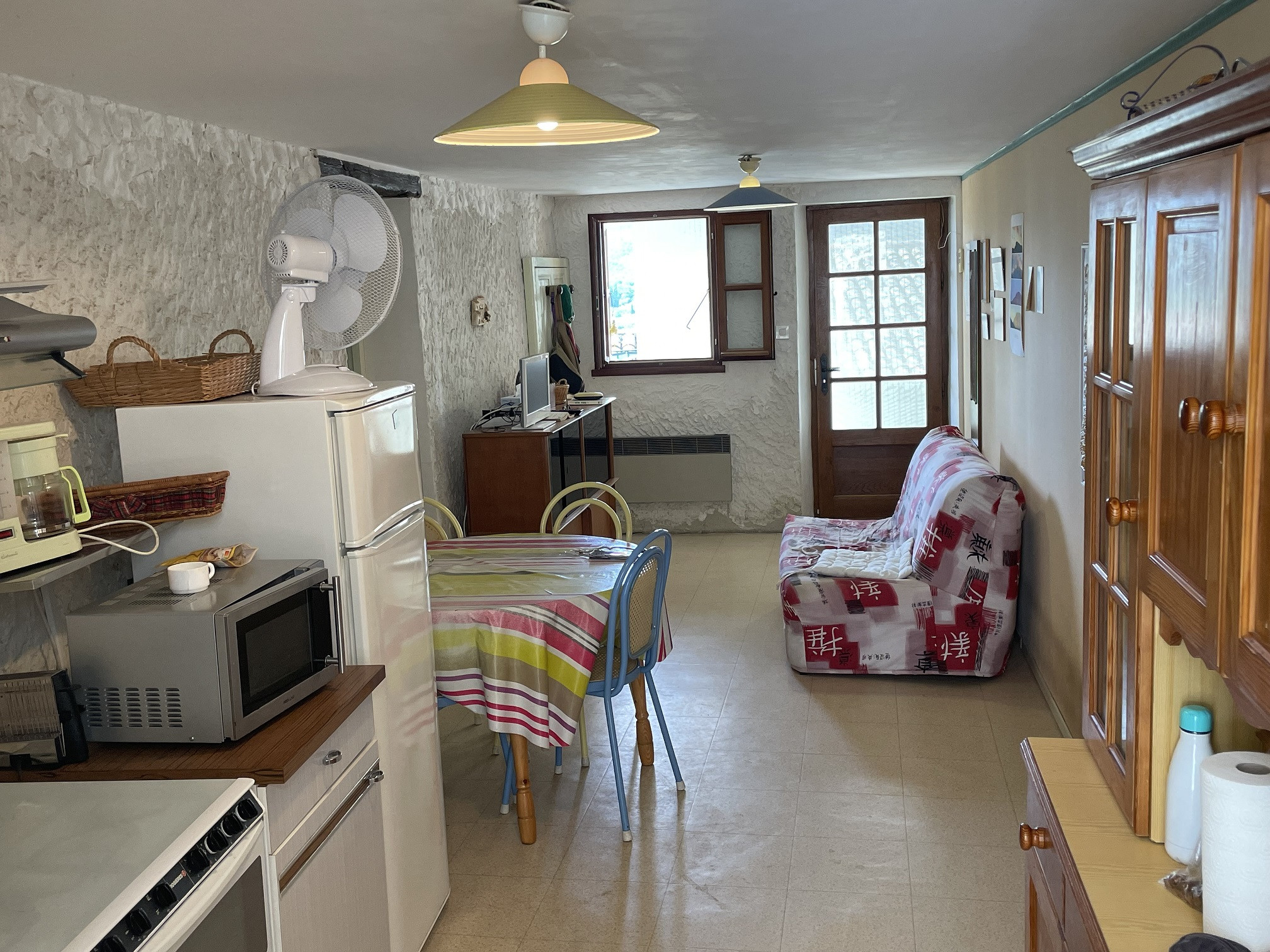 Cette maison traversante Nord-Sud sur 2 niveaux + une mezzanine de 26 m² comprend un séjour-cuisine de 20m², une chambre, un wc, le tout donnant sur une terrasse avec vue imprenable sur les montagnes environnantes. A l'étage, une mezzanine composée de 2 pièces avec une belle capacité de couchage. Au rez-de chaussée, une pièce voutée très fraîche l'été, une salle de bain à rénover, une cave et un wc. Chauffage électrique, tout-à-l'égout, pas de servitude.